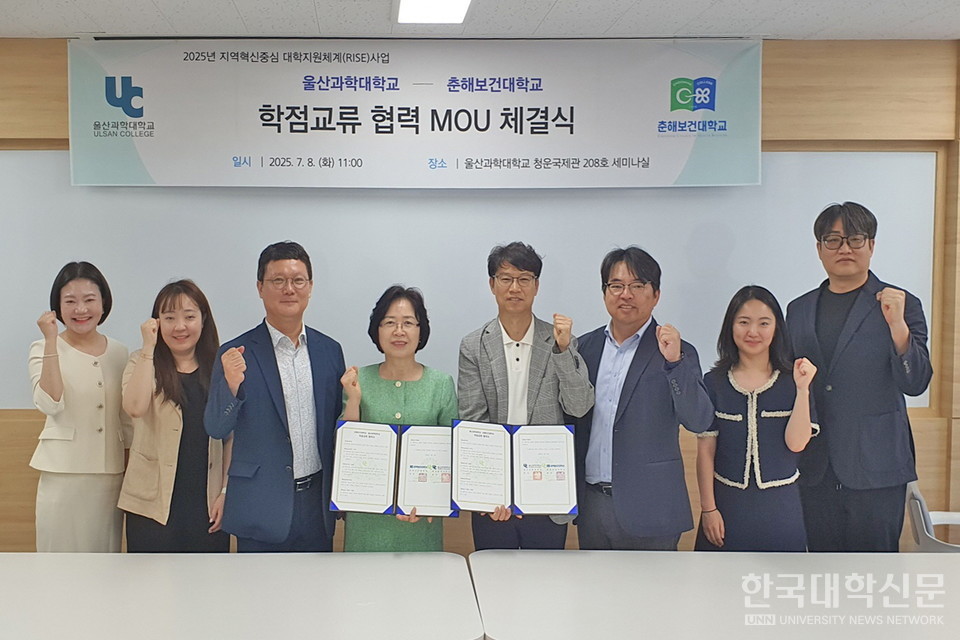 [한국대학신문 김영성 기자] 울산과학대학교(총장 조홍래)가 8일 오전 서부캠퍼스 청운국제관 208호 세미나실에서 춘해보건대학교(총장 김희진)와 학점교류를 위한 업무 협약을 체결했다.