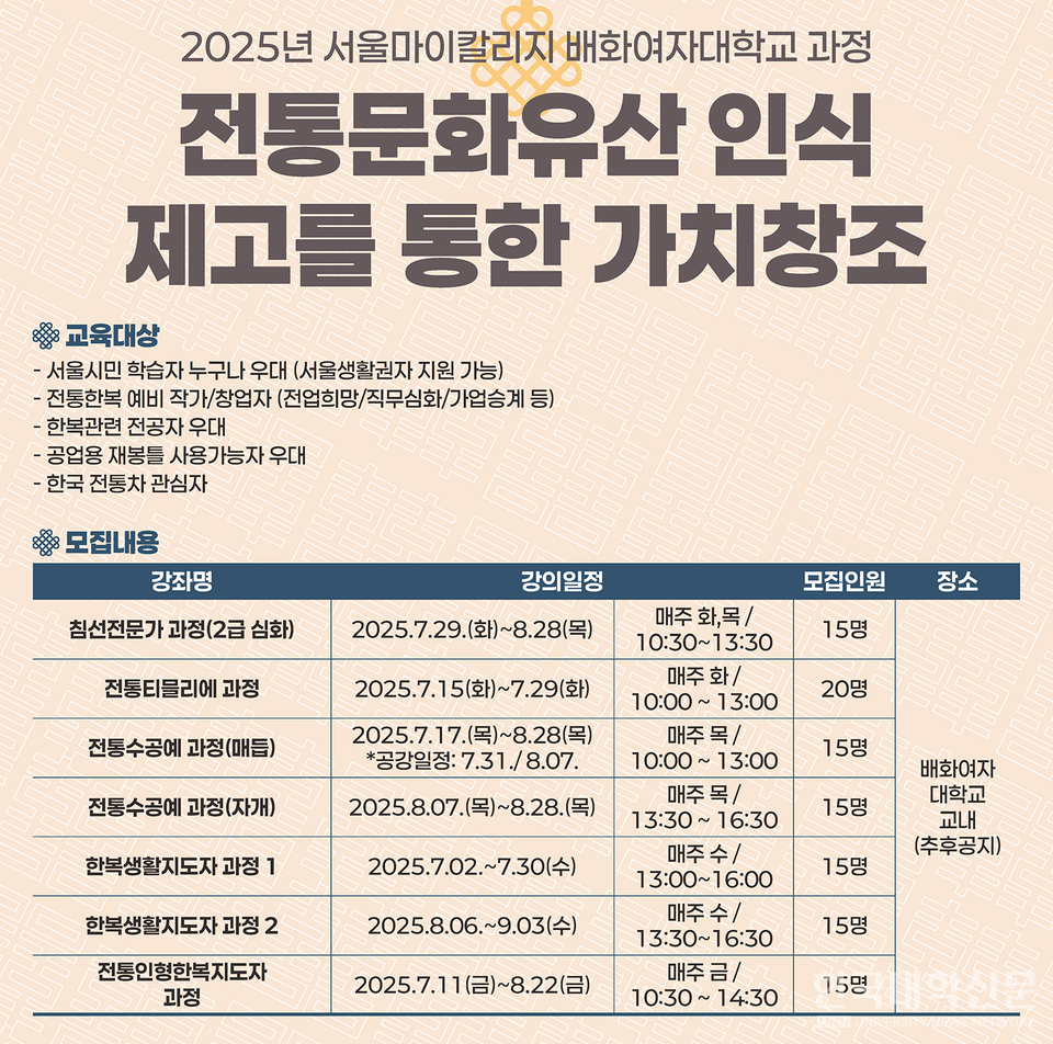 [한국대학신문 이서혜 기자] 배화여자대학교(총장 이후천)는 서울마이칼리지과정을 통해 전통문화 인재 양성에 앞장선다.