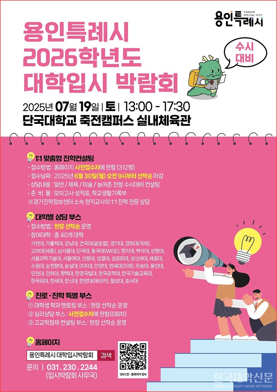 [한국대학신문 김연주 기자] 단국대와 용인특례시가 오는 19일(토) 죽전캠퍼스 체육관에서 ‘2026학년도 용인특례시 대학입시 박람회’를 개최한다. 이번 박람회는 수험생과 학부모에게 수시전형을 중심으로 최신 대학입시 정보를 제공하고, 학생 맞춤형 대입 전략 수립을 지원하기 위해 마련됐다.