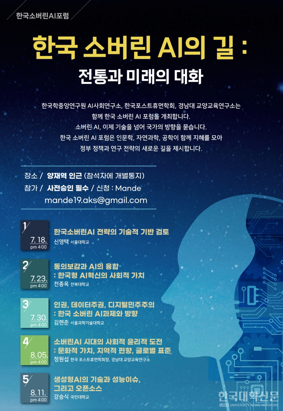 [한국대학신문 이정환 기자] 한국학중앙연구원 AI사회연구소(소장 한도현)는 한국포스트휴먼학회, 경남대학교 교양교육연구소와 공동으로 ‘한국소버린AI포럼’을 창립하고, 오는 18일부터 8월 11일까지 총 5회에 걸쳐 콜로키움을 개최한다고 밝혔다.