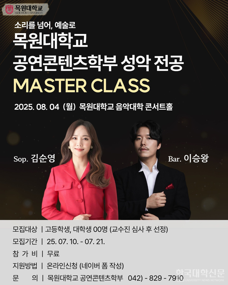 목원대 공연콘텐츠학부는 ‘소프라노 김순영과 바리톤 이승왕 초청 성악 마스터클래스’를 다음달 4일 대학 콘서트홀에서 진행한다고 16일 밝혔다. 이번 마스터클래스는 충청권 음악 교육의 저변 확대를 위해 지역 고등학생 등 예비 수험생에게도 실연 참여와 청강의 기회를 제공한다.