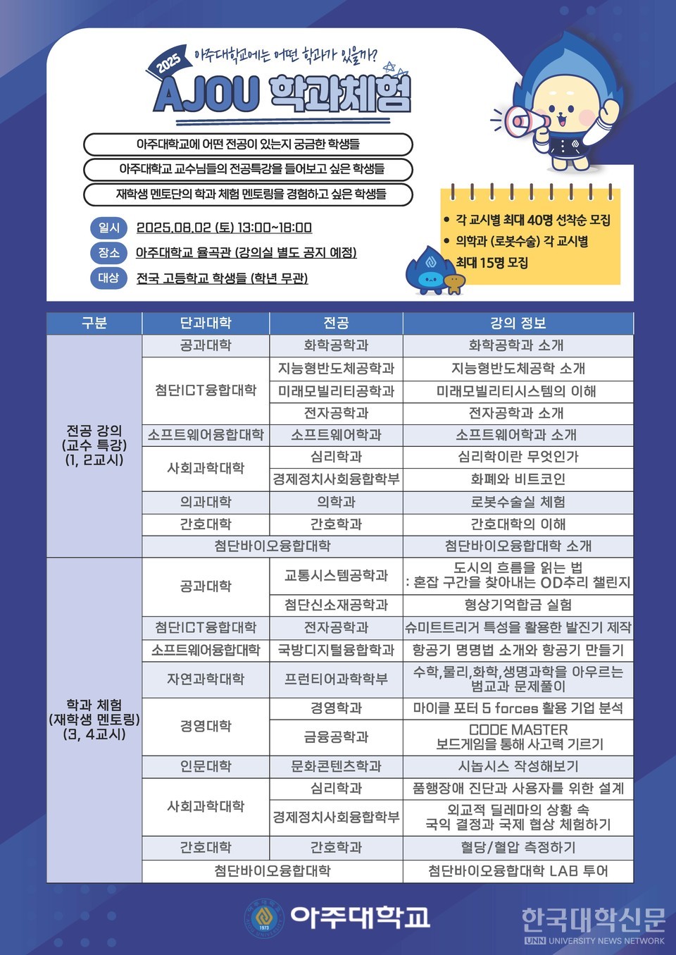 [한국대학신문 김연주 기자] 아주대학교는 대학 전공 체험을 통해 적성과 진로를 탐색할 수 있는 기회를 제공하고자 ‘AJOU 학과체험’ 행사를 8월 2일 개최한다. 17일부터 25일까지 전국 고등학생 400명을 선착순 모집하며 아주대 입학처 홈페이지(www.iajou.ac.kr/intro/)에서 신청을 받는다.