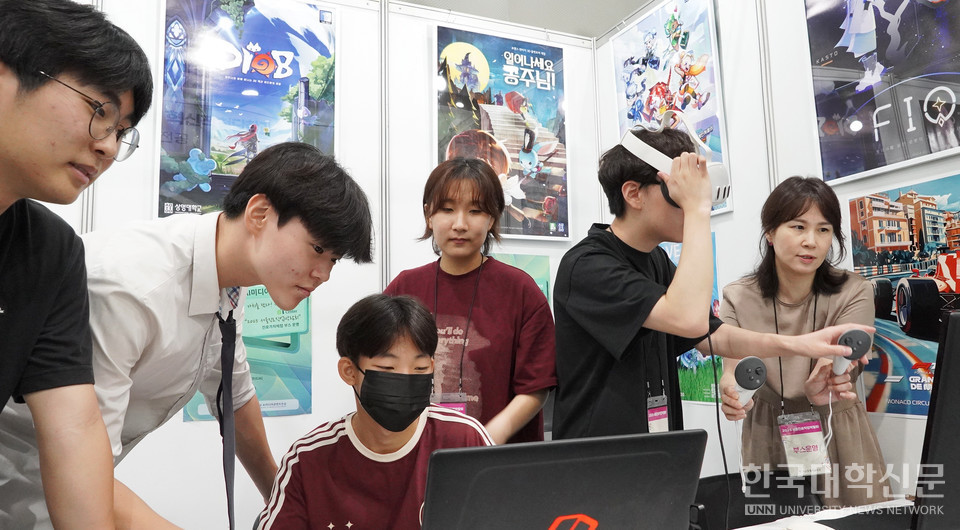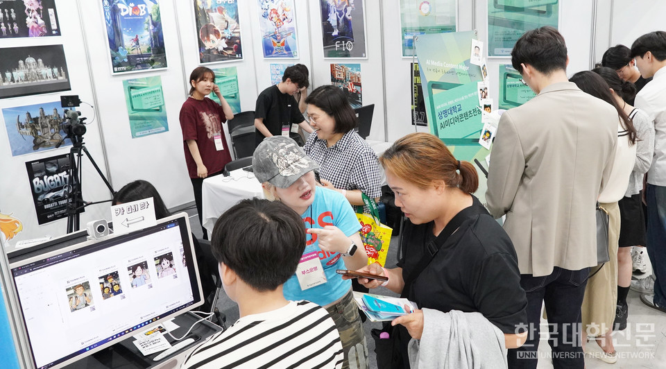 올해 기존 디지털콘텐츠학과에서 AI를 융합해 교육부 첨단학과로 지정된 상명대 AI미디어콘텐츠전공 부스의 교수와 재학생들이 고등학생들에게 재학생들이 제작한 VR 게임콘텐츠와 AI포토체험을 안내하고 있다.(맨 위, 두번째)