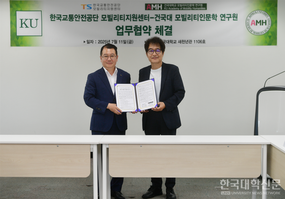 [한국대학신문 김경태 기자] 건국대학교 모빌리티인문학 연구원(원장 신인섭)은 지난 11일 한국교통안전공단 모빌리티지원센터(센터장 하재도)와 업무협약(MOU)을 체결하고, 모빌리티 관련 정책 홍보와 학술 교류 전반에 걸친 협력 체계를 구축하기로 했다.