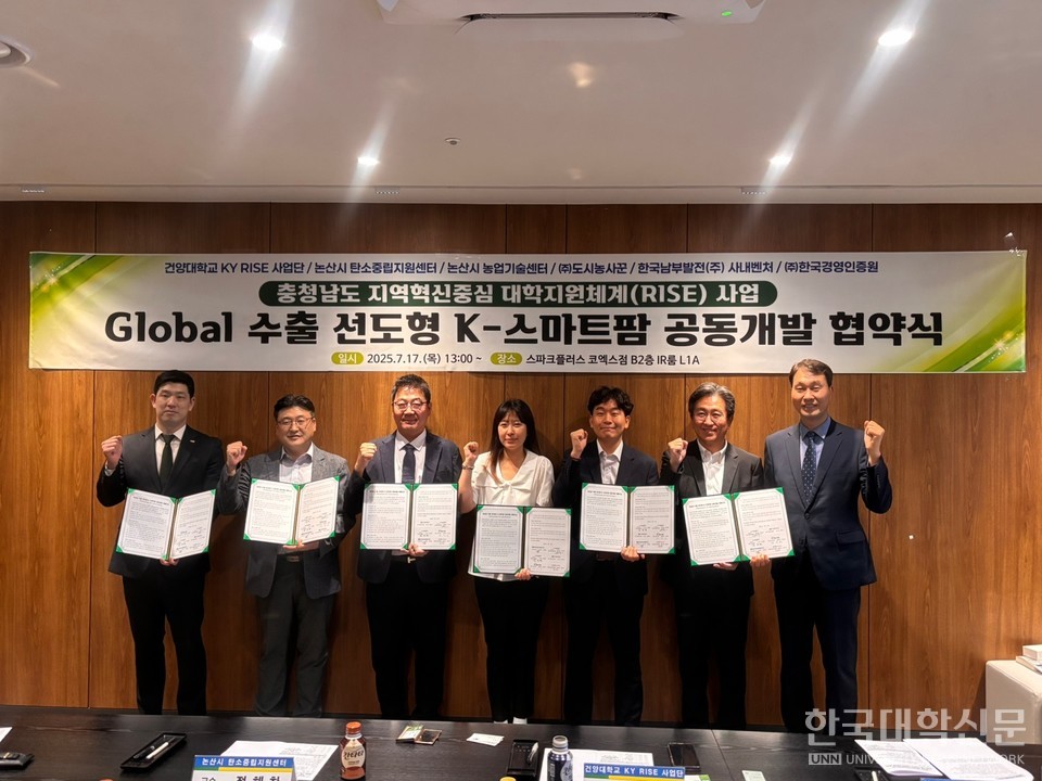 [한국대학신문 이정환 기자] 건양대학교(총장 김용하), 논산시 농업기술센터(소장 김정필), 논산시 탄소중립지원센터(센터장 진주완), ㈜도시농사꾼(대표 전정욱), 한국남부발전㈜ 사내벤처(대표 최재환), ㈜한국경영인증원(원장 최원)이 ‘글로벌 수출 선도형 K-스마트팜 공동개발 협약’을 체결하며 K-스마트팜의 해외 진출을 위한 강력한 협력체계를 구축했다.