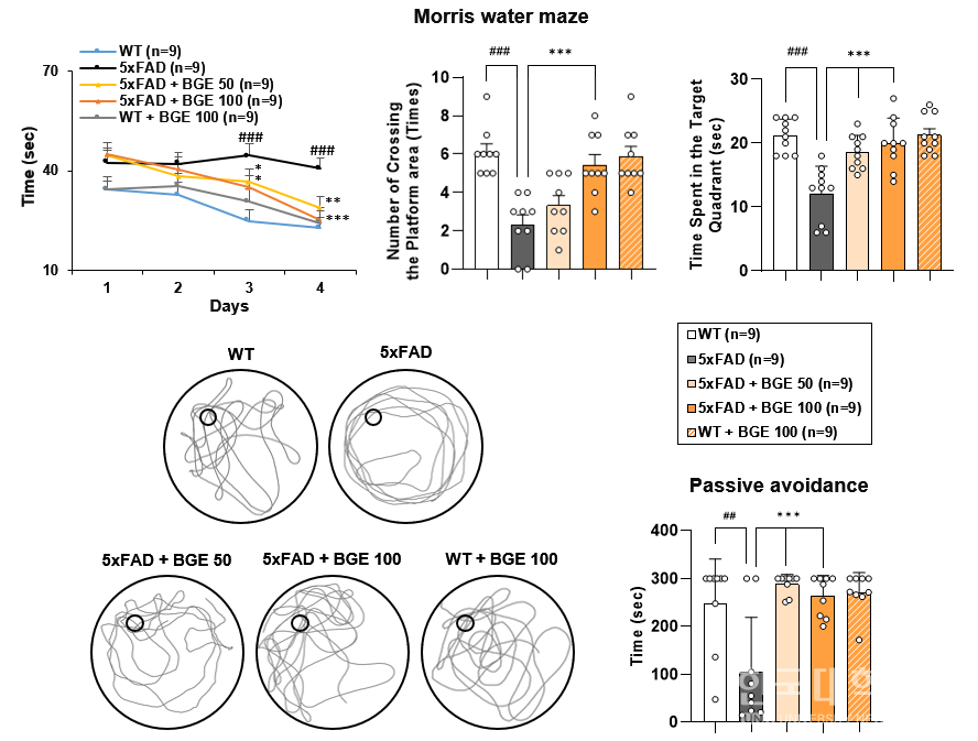 연구팀은 알츠하이머병 동물모델에 흑삼 농축액을 체중 1㎏당 50㎎ 또는 100㎎씩 16주간 경구 투여헸다. 이후 ‘모리스 수중 미로(Morris Water Maze)’ 실험을 통해 장기 기억력을 평가한 결과, 흑삼 투여군은 숨겨진 플랫폼을 찾는 데 걸리는 시간이 각각 28.7초(50㎎)와 25.1초(100㎎)로, 투여하지 않은 모델 대비 단축되는 양상을 보였다. 특히 100㎎ 투여군의 수행 시간은 정상군(22.7초)에 비교적 가까운 수치를 보여, 흑삼이 기억력 저하를 부분적으로 개선할 가능성을 시사했다.
