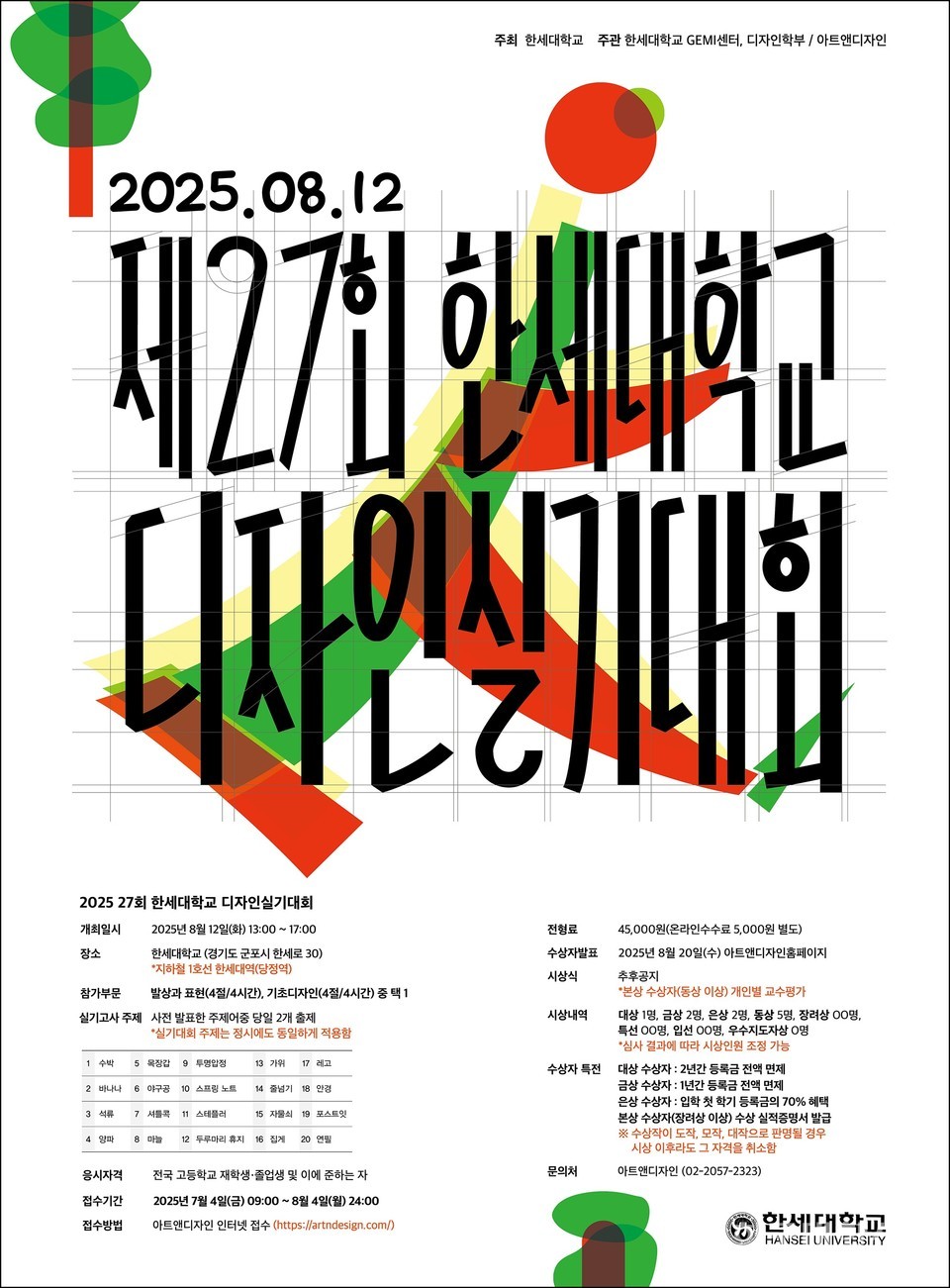 제27회 한세대학교 디자인실기대회는 오는 8월 12일 오후 1시부터 4시간 한세대에서 진행된다. 전국 고등학교 재학생과 졸업생 등 참가 신청자는 ‘발상과 표현’ 또는 ‘기초 디자인’ 중 택일해 지원한 참가 부문에 대해서 사전 발표된 주제어 중 당일 발표되는 2가지 주제에 맞춰 실기 작품 규격인 켄트지 4절지에 표현해야 한다.