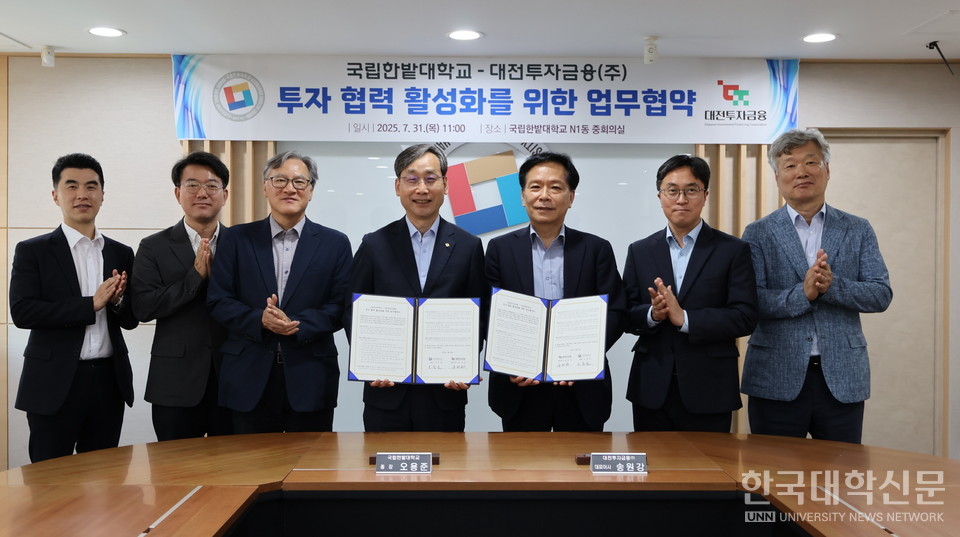 [한국대학신문 정수정 기자] 국립한밭대학교(총장 오용준)는 지난 31일 대학본부에서 대전투자금융㈜과 대학 기술의 사업화와 지역 창업 생태계 활성화를 위한 투자 협력 활성화 업무협약을 체결했다.