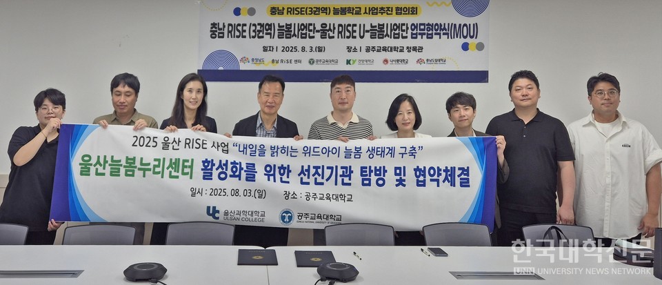 이번 협약은 울산광역시의 RISE사업 단위과제인 ‘늘봄누리센터’사업(울산과학대, 울산대, 춘해보건대)과 충청남도 RISE 단위과제인 ‘늘봄학교 고도화 사업’ 3권역(공주교대, 건양대, 나사렛대, 충남도립대)의 상호 연계·협력을 통해 지역 맞춤형 초등 돌봄 생태계 구축 및 권역 간 프로그램 공동 개발을 목적으로 한다.