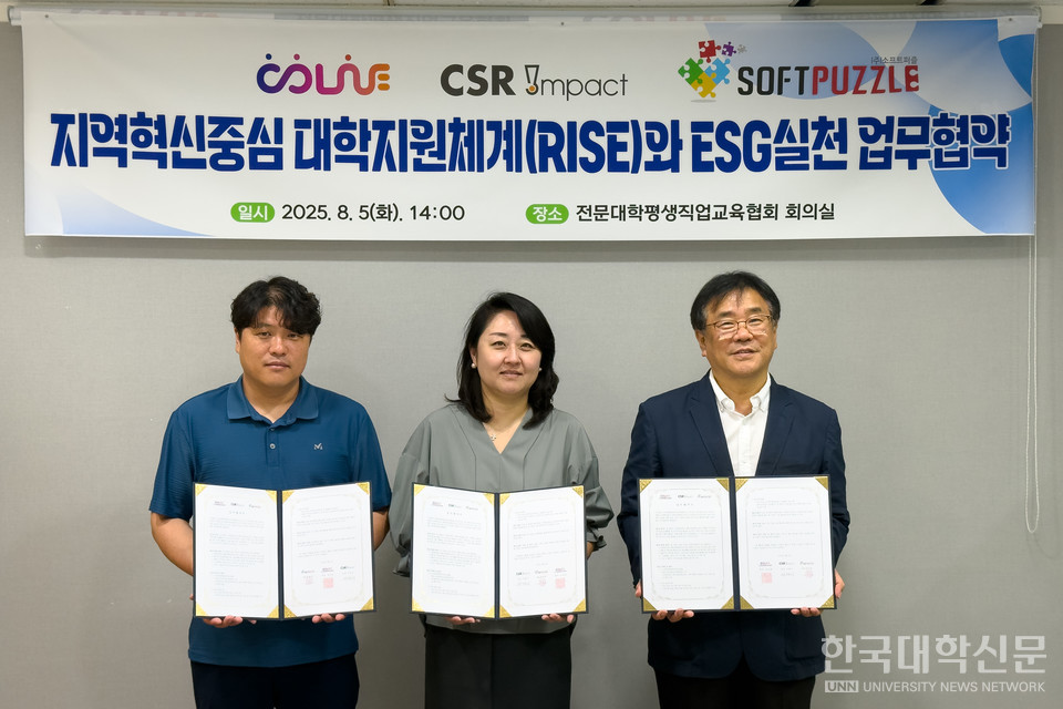 [한국대학신문 이정환 기자] 사단법인 전문대학평생직업교육협회(COLiVE), CSR IMPACT㈜, ㈜소프트퍼즐이 5일 지역혁신중심 대학지원체계(RISE)와 ESG실천 프로젝트의 공동 수행을 위한 3자 업무협약(MOU)을 체결했다.