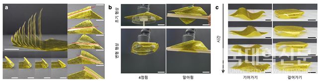 연구팀은 이러한 문제를 해결하기 위해 ‘현장 프로그래밍(field-programmability)’ 개념을 접이식 구조에 성공적으로 도입했다. ‘접힘을 어디서, 어느 방향으로, 얼마나 크게 할지’라는 사용자의 명령을 소재 형상에 실시간으로 반영할 수 있는 소재 기술과 프로그래밍 방법론을 통합적으로 제안했다.