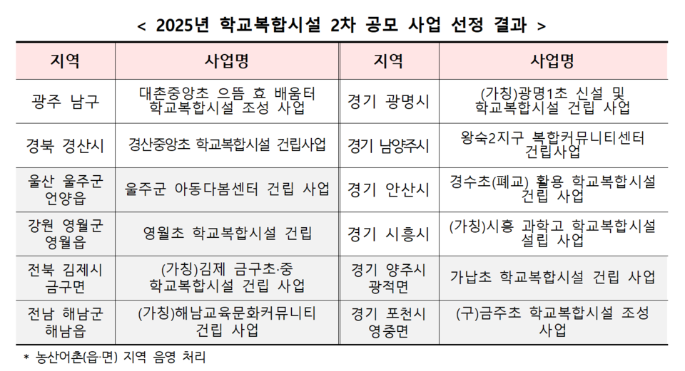 [한국대학신문 임지연 기자] 지역사회와 학교가 함께 이용하는 교육·문화·체육시설 확충을 위해 추진 중인 ‘학교복합시설 사업’에 울산 울주군 언양읍, 강원 영월군 영월읍 등 농산어촌 지역 6개 사업을 포함한 총 12개 사업이 추가 선정됐다.