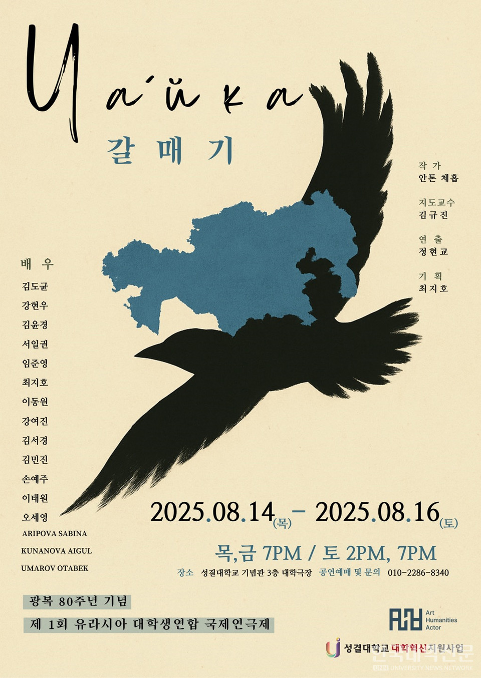 [한국대학신문 이정환 기자] 성결대학교(총장 정희석)가 오는 14일(금)부터 25일(월)까지 성결대에서 ‘광복 80주년 기념 제1회 유라시아 대학생 연합 국제 연극제’를 세계 최초로 개최한다.
