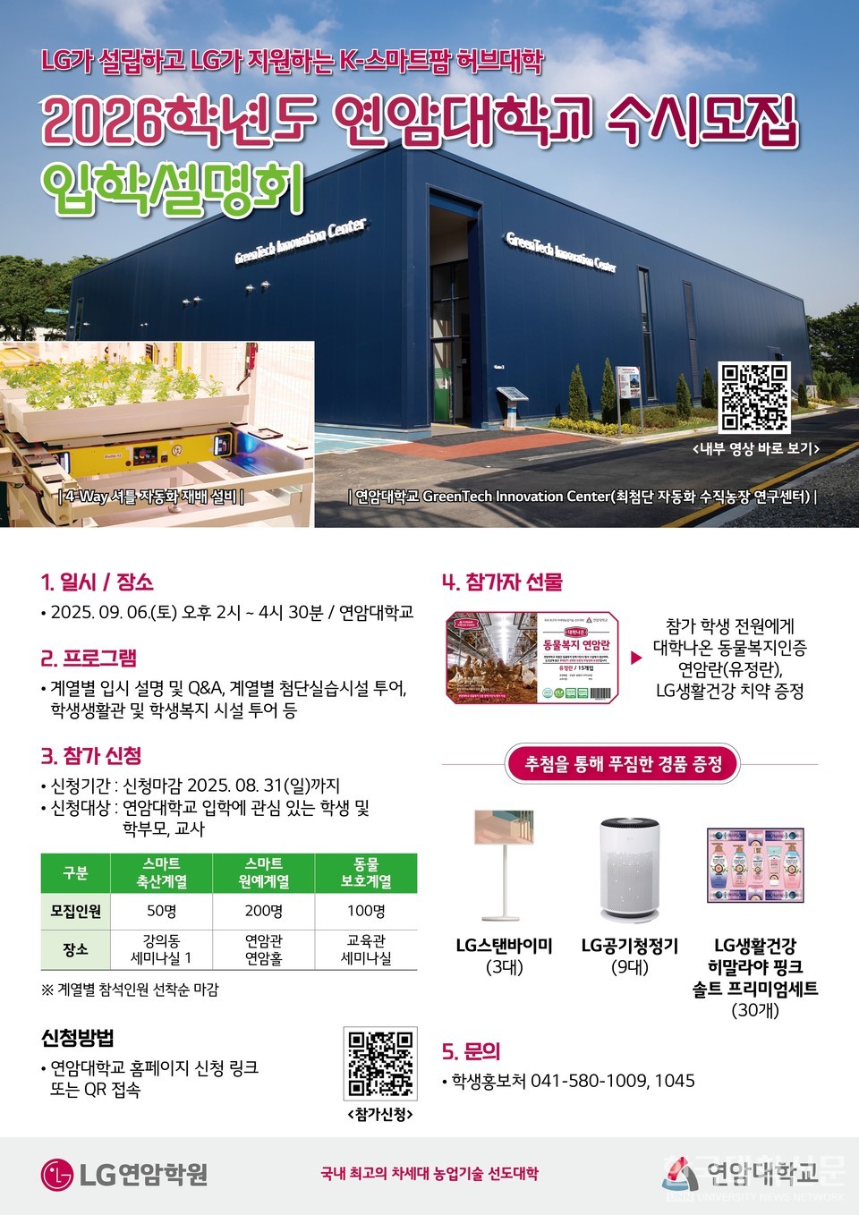 이번 입학설명회는 스마트축산계열 50명, 스마트원예계열 200명, 동물보호계열 100명 등 선착순 사전 신청 접수로 마감된다. 신청은 오는 8월 31일(일)까지 입학 홈페이지와 QR코드를 통해 가능하다.
