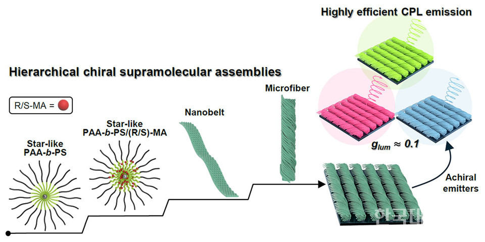 김동하 교수팀은 이를 해결하기 위해 비키랄 별모양 구조의 양친성 블록 공중합체와 키랄 소분자(R/S-만델산)를 수소결합으로 결합하고, 열 처리를 통해 키랄 공동조립을 유도했다. 이 과정에서 나노벨트 구조가 나선형 마이크로섬유로 발전하는 계층적 키랄 조립체를 형성했으며, 나선의 방향성(handedness)은 사용된 만델산의 광학이성질체에 의해 결정됐다.