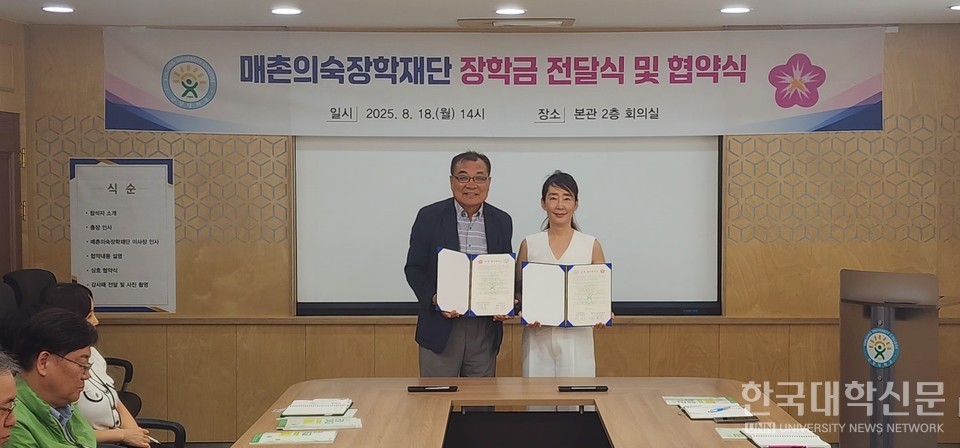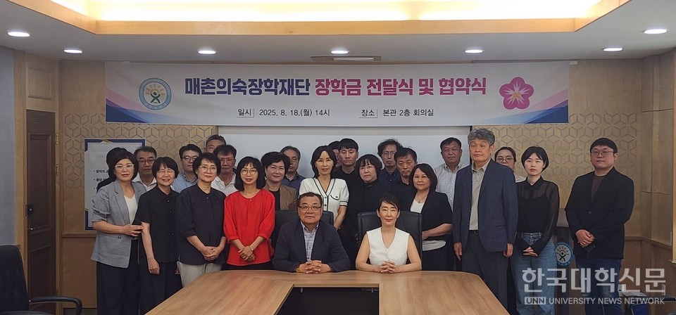 [한국대학신문 김영성 기자] 군장대학교(총장 이진숙)는 19일 대학 대회의장에서 매촌의숙장학재단(이사장 정회상)과 민・학협력 협약식을 갖고, 매촌의숙장학재단으로부터 장학금 5백만원을 기탁받았다고 전했다.
