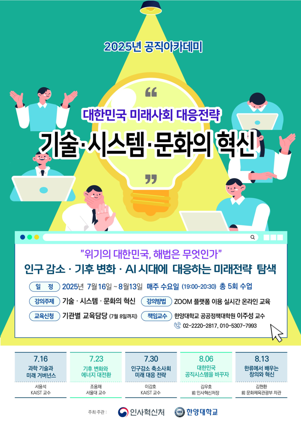 [한국대학신문 문화춘 기자] 한양대학교 정부혁신정책연구소(소장 이주성)는 지난달 16일부터 8월 13일까지 5주간 중앙부처 국가공무원 65명을 대상으로 ‘공직아카데미’를 성공적으로 마쳤다고 20일 밝혔다.