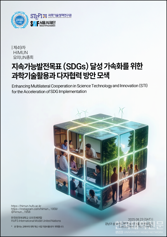 [한국대학신문 문화춘 기자] 한국외국어대학교(총장 박정운) 모의국제연합(HUFS International Model United Nations, 이하 HIMUN, 하이문)은 과학기술정책연구원(STEPI), 서울AI재단(SAIF)과 공동으로 오는 23일(토) 오후 1시, 서울 강남구 섬유센터 Tex+Fa홀에서 ‘지속가능발전목표(SDGs) 달성 가속화를 위한 과학기술 활용과 다자협력 방안 모색’을 의제로 제49차 모의유엔총회를 개최한다. 이번 총회는 일반인에게 무료로 공개되며, 현장 참관이 가능하다.