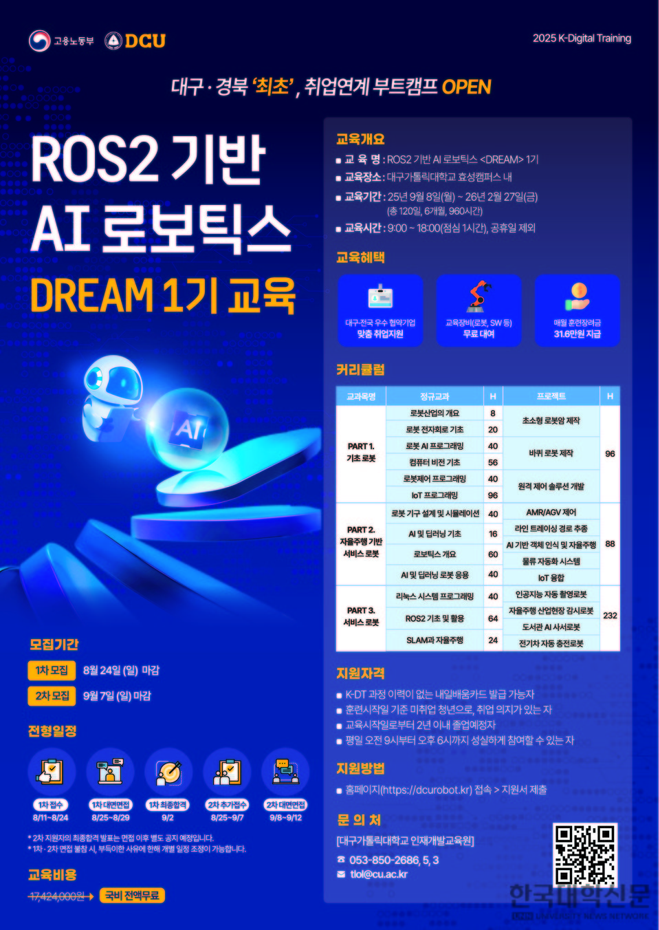 [한국대학신문 박인규 기자] 대구가톨릭대학교(총장 성한기) 산학협력단 인재개발교육원이 고용노동부 주관 ‘K-디지털 트레이닝(KDT)’ 사업에 최종 선정됐다. 이에 따라 대구·경북 지역에서는 유일하게 ROS2 기반 인공지능(AI) 융합 로보틱스 부트캠프를 개설하고, 2025년 하반기부터 교육생 모집에 들어갔다.