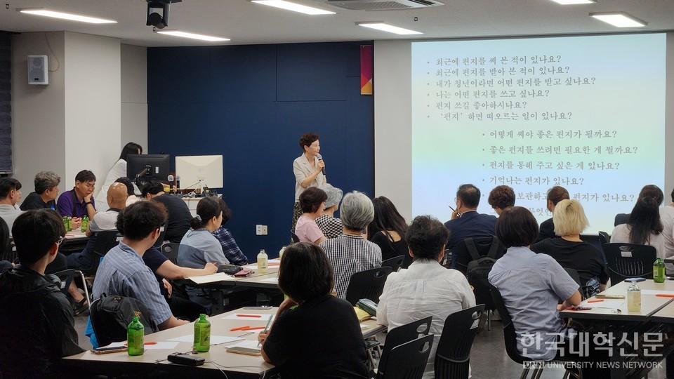 이날 답장 작성에 앞서 만학도 재학생들이 청년학생들의 고민에 대해 잘 답장을 작성할 수 있도록 수성대는 글쓰기 및 심리상담 전문가 윤미경 작가를 초청해 ‘나를 꺼내서 편지쓰기, 너를 보며 편지쓰기’라는 주제로 감정열기, 인생회고, 자기성찰, 청년고민, 소통방법, 세대공감 등의 내용으로 글쓰기 교육을 진행했다.
