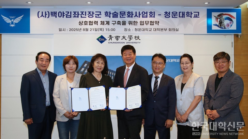 [한국대학신문 김경태 기자] 청운대학교(총장 정윤)는 21일 대학본부 8층 회의실에서 (사)백야김좌진장군 학술문화사업회(이사장 고삼숙)와 업무협약을 체결했다고 밝혔다.