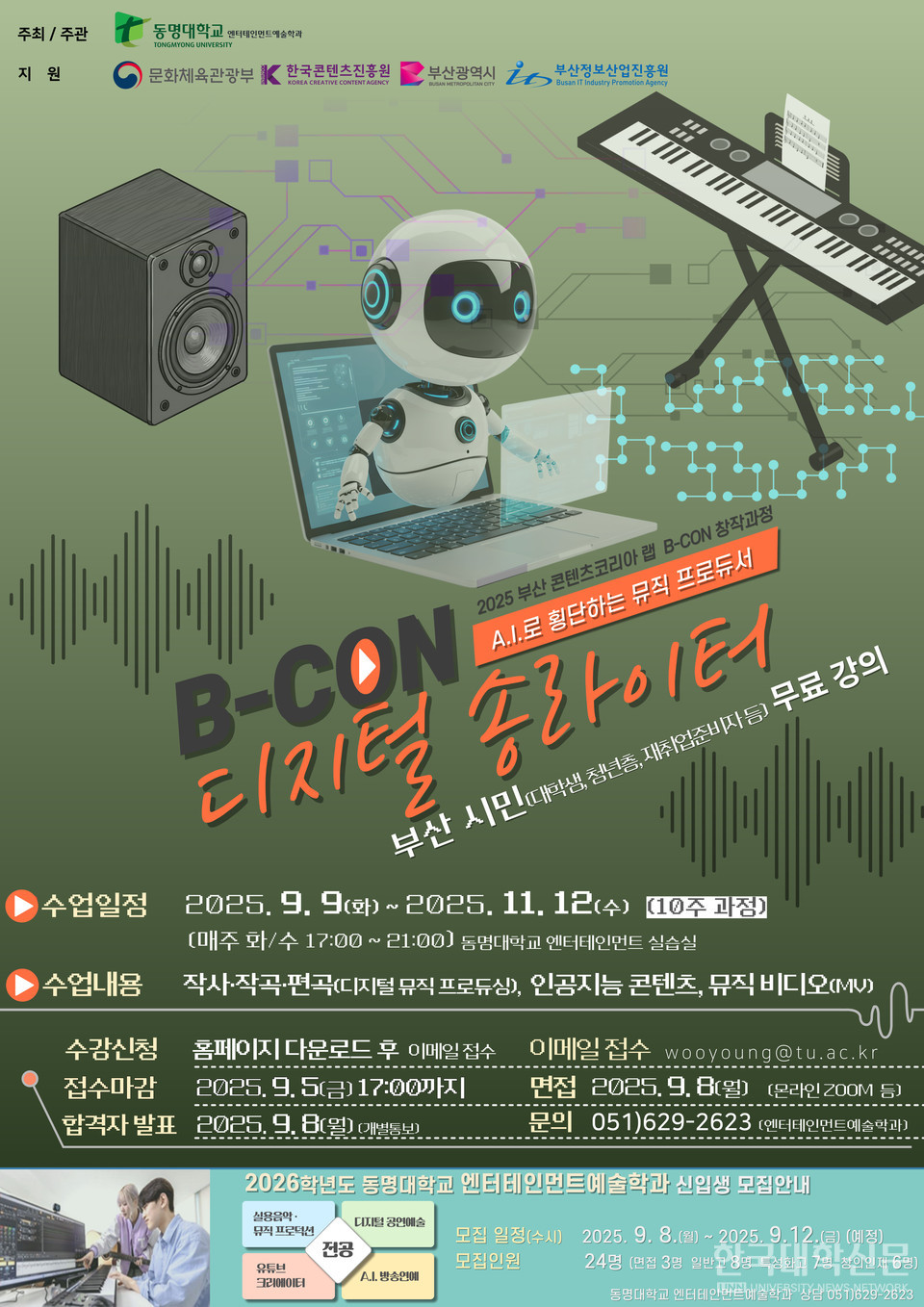 커리큘럼은 AI 음악 도구와 디지털 제작기술을 접목한 프로젝트 기반 수업으로서 △엔터테인먼트 기획 및 콘텐츠 유통 △사운드 프로듀싱 실무 △뮤직비디오 제작 등이 중심이다. 20명 이하의 소수 정예반으로 운영된다. 9월 9일(화)부터 11월 12일(수)까지 10주간, 매주 화·수요일 오후 5시부터 9시까지 동명대 엔터테인먼트 실습실 및 레코딩 스튜디오에서 진행된다.