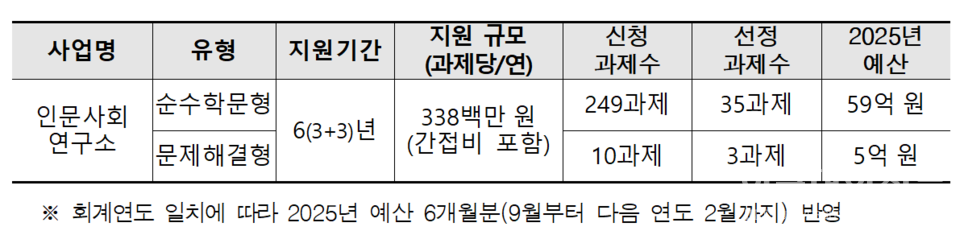 ‘인문사회 학술연구 지원사업’은 학문후속세대를 포함해 연구자의 성장단계별 연구 역량을 강화하고, 대학 부설 연구소 중심의 집단연구 기반을 구축하기 위해 1963년부터 교육부가 추진해 온 인문사회 분야의 대표적인 국가 연구개발 사업이다.