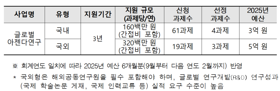 보편적인 글로벌 담론에 대한 다학제적 연구를 지원하는 사회과학 분야인 ‘글로벌 아젠다 연구’에는 총 7개의 신규과제가 선정됐다. 전년과 동일한 규모다. 국내형과 국외형의 의제별로 선정됐으며, 국내형은 사회구조의 변화 속에 한국형 갈등 양상에 대한 데이터 기반의 분석 및 예측 연구를, 국외형은 기술혁신이 초래하는 다양한 쟁점(이슈)과 변화에 따른 글로벌 수준의 대응 전략을 모색하는 연구를 수행하게 된다. 특히 국외형은 해외연구원과 공동연구를 통해 국제적인 연구 역량을 강화하는 기회가 될 것으로 전망된다.