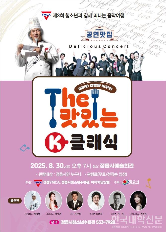 전북 정읍사예술회관에서 오는 30일(토) 저녁 7시 열리는 정읍YMCA·정읍시청소년수련관·아미치앙상블 주관, 제3회 청소년과 함께 떠나는 음악여행 ‘The 맛있는 K-클래식’ 연주회에는 ‘아미치 앙상블’ 대표 바리톤 김재창 씨와 바리톤 오동국 교수, 바리톤 정 경 씨, 소프라노 박서연 씨, 테너 정찬혁 씨, 피아노 평미영 씨가 무대에 올라 멋진 K-클래식의 향연을 선사한다.