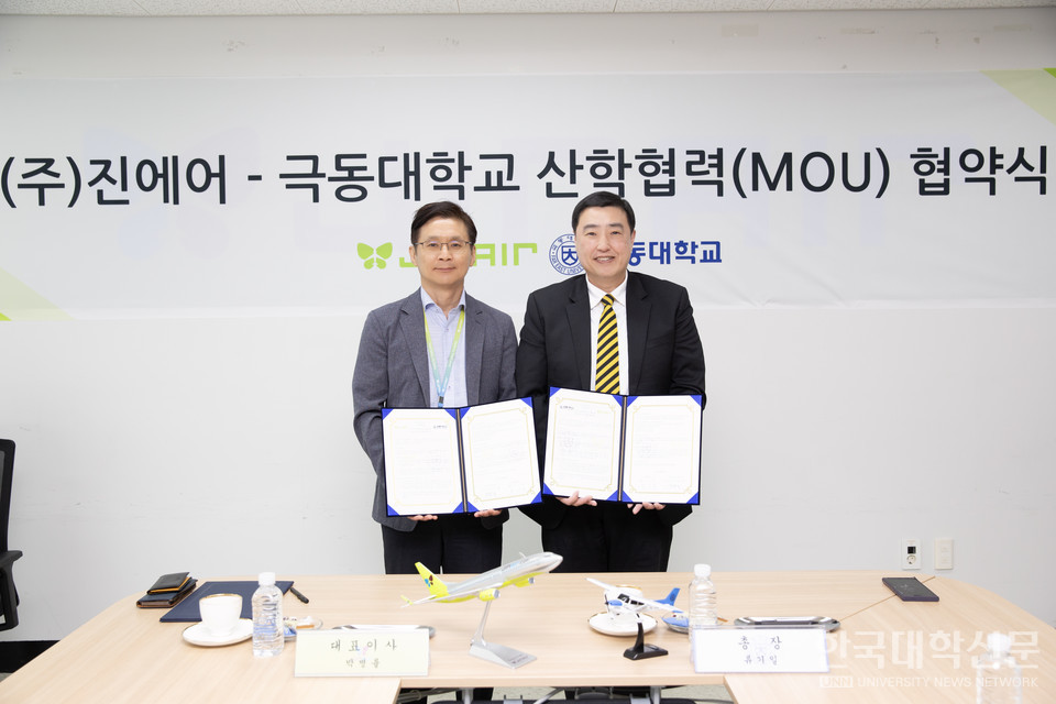 [한국대학신문 이정환 기자] 극동대학교(총장 류기일)와 ㈜진에어(대표이사 박병률)는 26일 서울 강서구 마곡동 진에어 본사 대회의실에서 ‘우수 조종자원 선발 및 양성 프로그램 협약식’을 개최하고, 항공 전문 인재 양성을 위한 산학협력에 나섰다.