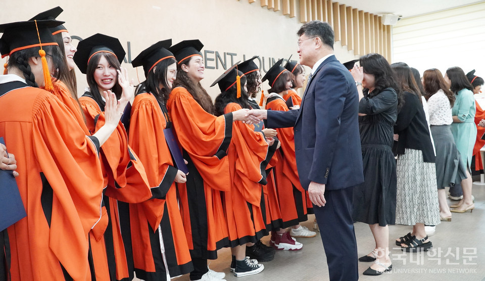 학위복을 입은 수료생들이 자신들에게 한국어를 가르치고 문화체험 등 추억을 함께 한 김광희 한국어교육원장을 비롯한 한국어 강사들과 악수를 나누며 아쉬운 작별인사를 나누고 있다.(두번째)