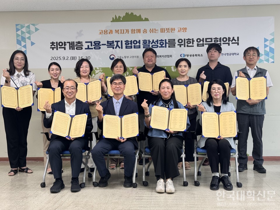 [한국대학신문 김경태 기자] 한국항공대학교 대학일자리플러스센터는 2일 고용노동부 고양지청(고양고용복지플러스센터), 고양시 사회복지관협의회(관내 종합사회복지관 9개소), 고양상공회의소와 고양지역 취업취약계층에 대한 맞춤형 고용지원과 일자리 활성화를 위해 ‘취약계층 고용-복지서비스 협업 활성화를 위한 업무협약’을 체결했다.