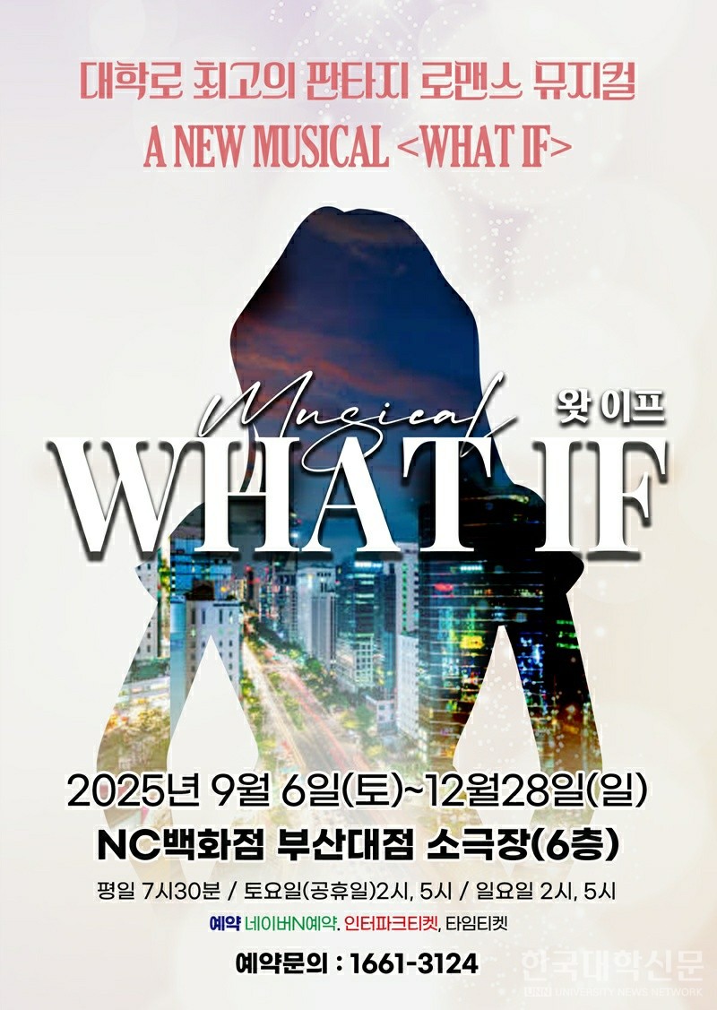 [한국대학신문 김윤미 기자] 이우영 동명대 엔터테인먼트예술학과 교수가 작곡한 창작 뮤지컬(로맨틱 코미디) ‘왓이프(What If)’가 부산에서 선보인다. 오는 6일부터 12월 28일까지 NC백화점 부산대점 소극장에서 상설로 공연이 펼쳐진다.