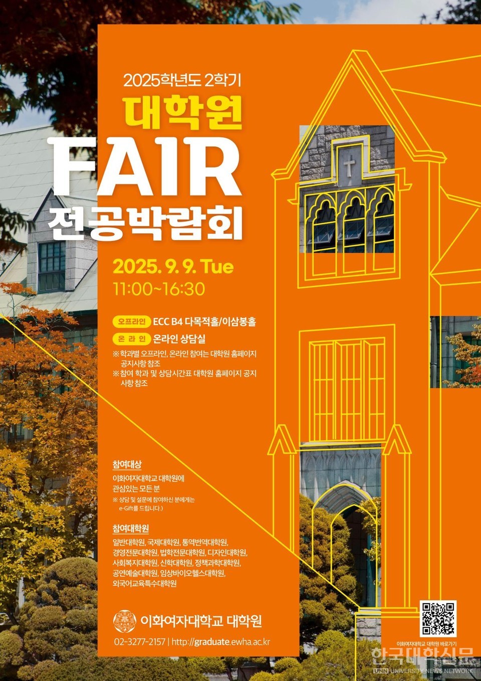 [한국대학신문 이정환 기자] 이화여자대학교(총장 이향숙)는 2025학년도 2학기를 맞아 ‘제29회 대학원 페어(FAIR) 및 전공박람회’를 오는 9일(화) 오전 11시 ECC 이삼봉홀과 다목적홀에서 개최한다.
