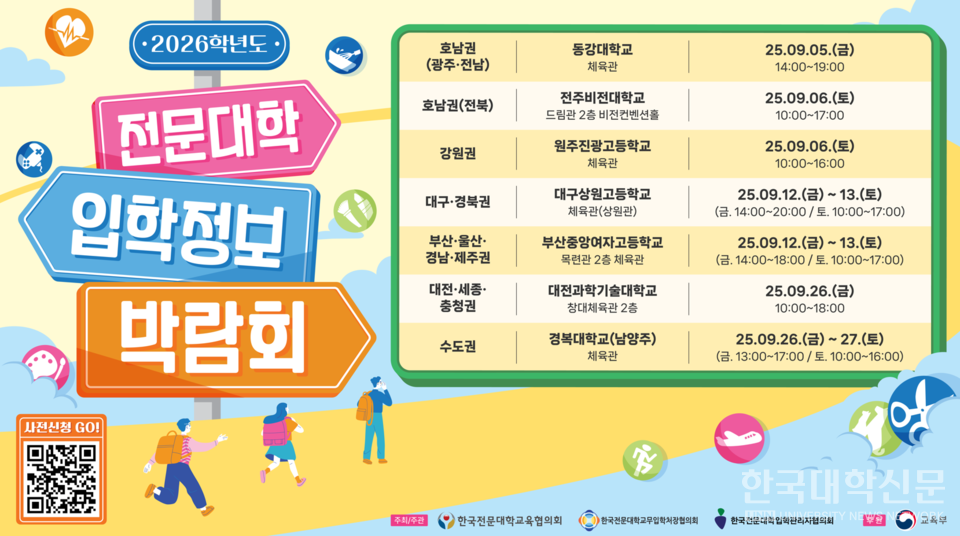 [한국대학신문 정수정 기자] 한국전문대학교육협의회(회장 김영도)는 지난 5일부터 오는 27일까지 2026학년도 전문대학 입학정보박람회를 지역별로 개최한다. 이번 박람회는 수험생과 학부모들에게 대학멸 맞춤형 입학정보를 제공하기 위해 마련됐다.