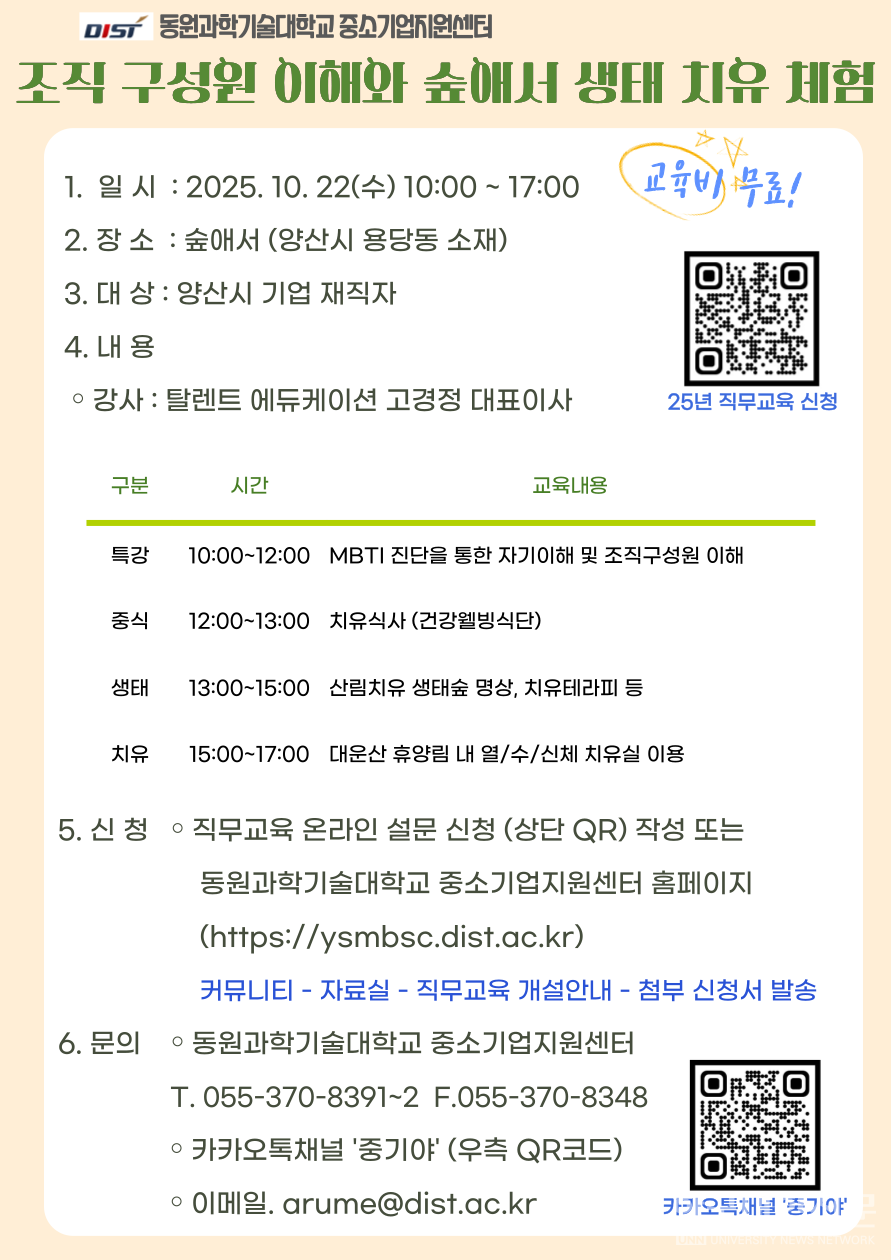 [한국대학신문 이서혜 기자] 동원과학기술대학교 중소기업지원센터는 오는 10월 22일(수), 양산시 재직자를 대상으로 한 생태 치유 특강을 진행한다.