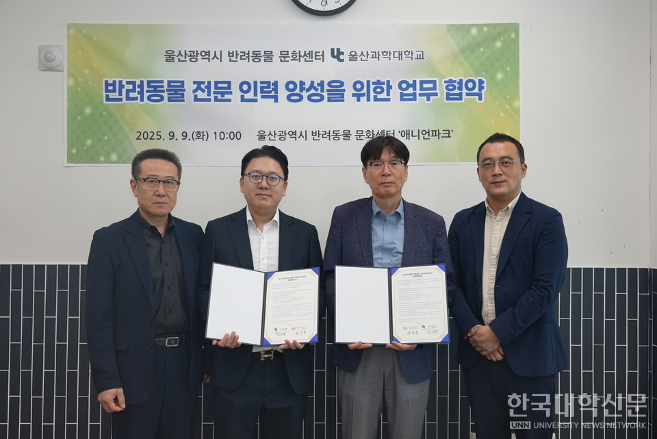 [한국대학신문 심정은 기자] 울산과학대학교(총장 조홍래)가 울산광역시 반려동물 문화센터(센터장 성기창)와 반려동물 관련 전문 인력 양성 및 건전한 반려동물 문화 확산을 위한 업무 협약을 체결했다.