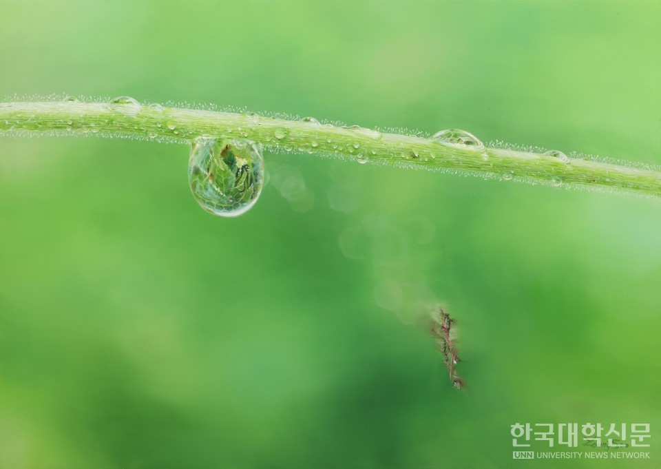 작가의 화면에 담긴 물방울 속 작은 세계는 자연의 사실적 재현을 넘어 관람객에게 정화와 성찰의 시간을 선사하는 ‘명상의 창’이 된다. 투명한 색채와 정밀한 표현은 찰나의 아름다움과 영롱한 울림을 드러내며, 자연 속 생명의 숨결과 순환을 회화적 언어로 풀어낸다. 이번 전시에서는 물방울뿐만 아니라 낙엽과 꽃잎 등 일상의 자연 소재를 통해 삶과 시간의 순환을 성찰하는 작품들을 함께 선보인다.