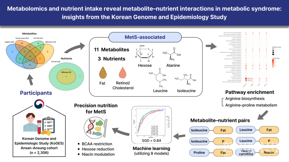 연구 모식도는 KoGES 안산·안성 코호트(2천306명)를 기반으로 135종의 대사체와 23종의 영양소를 분석해 대사증후군과 연관된 11개의 대사체(헥소스·알라닌·BCAA 등)와 3개의 영양소(지방·레티놀·콜레스테롤)를 확인했으며, 경로 분석을 통해 아르기닌 대사 경로의 교란을 규명했다. 또한 8종의 머신러닝 모델 중 SGD 분류기가 가장 우수한 예측 성능을 보여, 대사체–영양소 상호작용에 기반한 대사증후군 개인 맞춤형 식이 전략의 가능성을 제시했다.