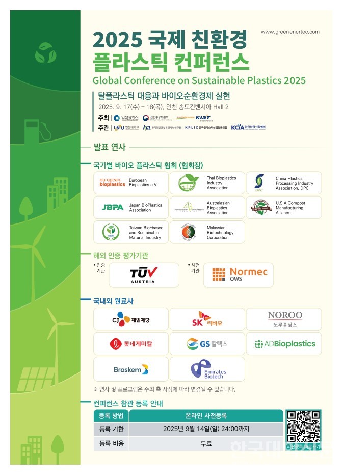 [한국대학신문 김윤미 기자] 전 세계 친환경·바이오플라스틱 전문가와 글로벌 기업이 한자리에 모이는 ‘2025 글로벌 친환경 플라스틱 Summit’이 오는 16일부터 18일까지 국립인천대 이노베이션센터와 송도컨벤시아에서 성대하게 열린다. 이번 행사는 인천 최대 규모의 신재생에너지 전시회인 ‘2025 그린에너텍(GreenEnerTEC)’과 동시에 개최되며, 국내외 10여 개국 바이오플라스틱 협회장, 글로벌 소재 기업, 정책기관, 전문가 등 1000여 명이 참가하는 세계 최대 규모의 친환경 플라스틱 행사다.