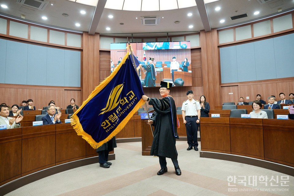 10일 오전 교내 국제회의실에서 열린 취임식에는 윤희성 학교법인일송학원 이사장, 교무위원, 교직원, 학생대표를 비롯해 김진태 강원특별자치도지사, 육동한 춘천시장, 언론사 관계자, 관내 대학 총장 등 주요 인사 약 100여 명이 참석한 가운데 진행됐다.