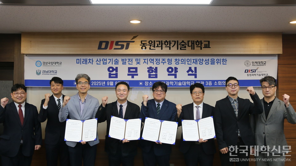 [한국대학신문 이정환 기자] 동원과학기술대학교(총장 장인성) 동원RISE사업단은 9일 본관 3층 회의실에서 경상국립대학교, 경남대학교, 인제대학교와 함께 ‘경남도내 미래차 분야 지역 정주형 창의인재 양성을 위한 업무협약’을 체결했다.