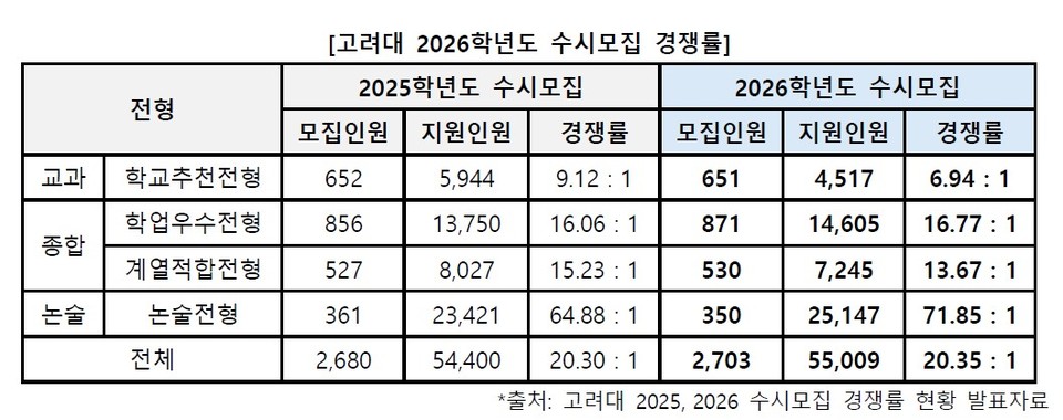 [한국대학신문 윤채빈 기자] 지난 10일 마감된 고려대학교 2026학년도 수시모집 원서접수에서 전체 경쟁률은 20.35대1로 집계돼 전년도 20.30대1과 큰 차이를 보이지 않았다.