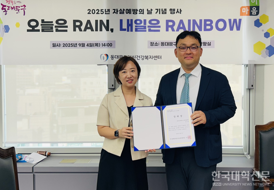 [한국대학신문 심정은 기자] 삼육보건대학교 학생상담센터(센터장 김보연)가 지난 5일, 동대문구청이 주최한 ‘자살예방의 날’ 기념행사 ‘오늘은 RAIN, 내일은 RAINBOW’에서 생명존중 문화 확산 및 자살예방에 기여한 공로로 상을 받았다. 이번 수상은 대학 내 생명존중 문화 조성과 자살 예방을 위한 다양한 활동의 성과를 인정받은 결과다.