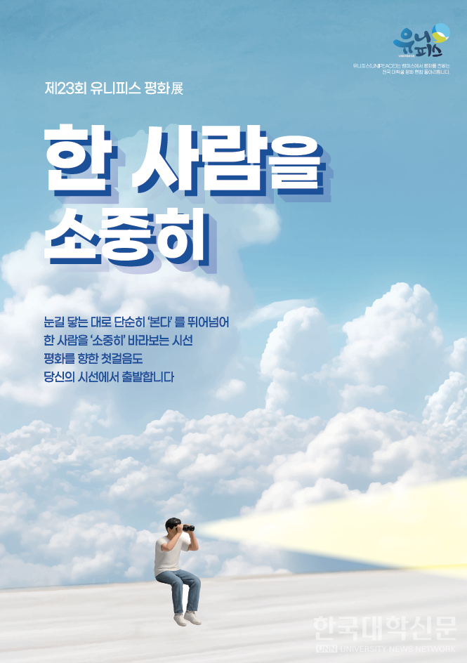 [한국대학신문 이정환 기자] 전국 대학생 평화연합동아리 유니피스(UNIPEACE)가 오는 13일부터 10월 2일까지 전국 주요 대학과 지역 사회 공간에서 제23회 평화패널전시를 개최한다. 올해 전시는 ‘한 사람을 소중히’를 주제로, 평화는 거창한 구호가 아니라 눈앞의 한 사람을 존중하는 따뜻한 시선에서 출발한다는 메시지를 전한다.