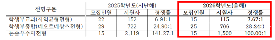 의예과는 전반적으로 높은 경쟁률을 보였다. 논술우수자전형에서는 15명 모집에 1500명이 지원해 100.00대1, 학생부종합(네오르네상스전형)은 25명 모집에 706명 지원으로 28.24대 1, 학생부교과(지역균형전형)도 15명 모집에 115명 지원으로 7.67대 1의 경쟁률을 보였다.
