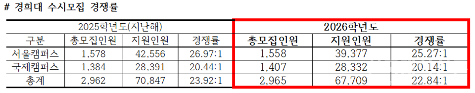 경희대 송주빈 입학처장은 “의대 정원 조정에 따라 의학계열과, 개업 효과가 사라진 열린전공 자율/자유전공학부 지원자가 전체적으로 줄어 전체 경쟁률이 소폭 하락한 것으로 보인다”라고 밝혔다.