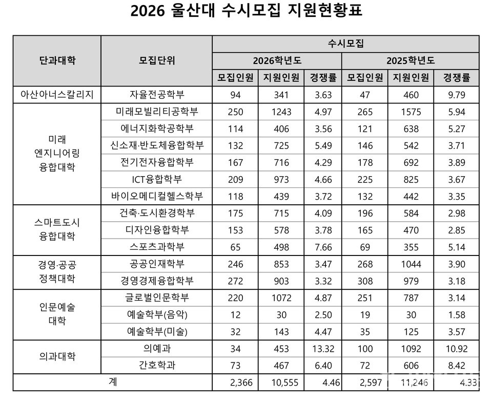 [한국대학신문 이정환 기자] 울산대학교(총장 오연천)가 2026학년도 총 모집인원 2484명 중 95%인 2366명을 수시모집으로 모집한 결과 모두 1만 555명이 지원해 전년도 4.33대1보다 상승한 4.46대 1의 경쟁률을 나타냈다.