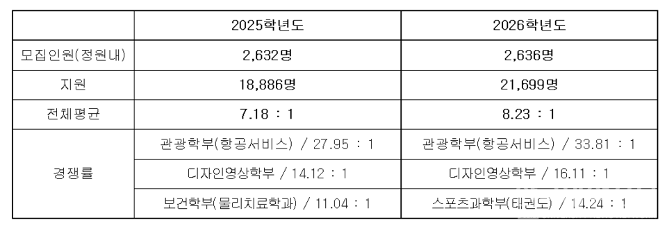 모집 분야 중 관광학부(항공서비스) 78명 모집에 2637명이 지원해 33.81대 1로 가장 높은 경쟁률을 보였으며, 디자인영상학부 195명 모집에 3142명이 지원해 16.11대 1, 스포츠과학부(태권도) 38명 모집에 541명이 지원해 14.24대 1로 그 뒤를 이었다.