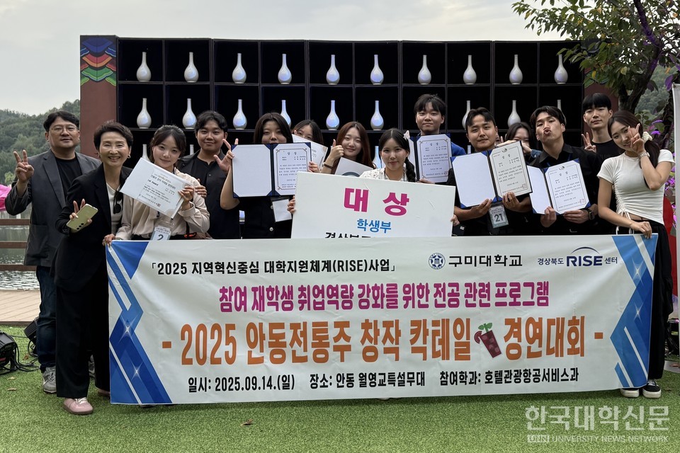 [한국대학신문 심정은 기자] 구미대학교(총장 이승환)는 호텔관광항공서비스과 학생들이 ‘2025 제3회 안동 전통주 창작 칵테일 경연대회’에서 대상 등을 수상하는 쾌거를 거뒀다고 15일 밝혔다.